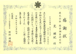 令和7年度 優秀管理技術者表彰(オホーツク総合振興局) 2025年12月09日 表彰 令和7年12月9日(火) 道路・防災部 荒 朋紀 対象業務:知床公園線(防交148)防災工事(法面設計) 【網走建設管理部発注】 上記業務において、当社職員が北海道オホーツク総合振興局網走建設管理部より令和7年度優秀管理技術者として表彰されました。